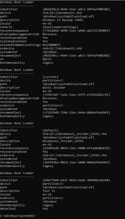 Dear JFX. 3 feature requests, if possible: 1. Option to create BCD volume without OS installation (useful with new disk when I already have vhd files and only want a boot menu on start). Of cause vhd entries will be done manually using bootice, or you can just set defaut names such as Windows10.vhd and Windows11.vhd. Ideally with gui for existing partition resize and creation of new EFI partition, but not a must. - Example: DISKPART/SELECT DISK/CREATE PARTITION EFI and populate it with BCD 2.Option to install minimal windows just for technical activities like rename main vhd, restore vhd from the backup etc. Something like what NTDEV's tiny11 script does just built in: https://github.com/ntdevlabs/tiny11builder 3. when VHD created it has an ESP partition, but it's not bootable, could you please add BCD to it when doing setup (kind of "bcdboot C:\Windows /s G: /f UEFI") will greatly help when running the VHD in the Hyper-V) Thanks in advance, really enjoying using your project!