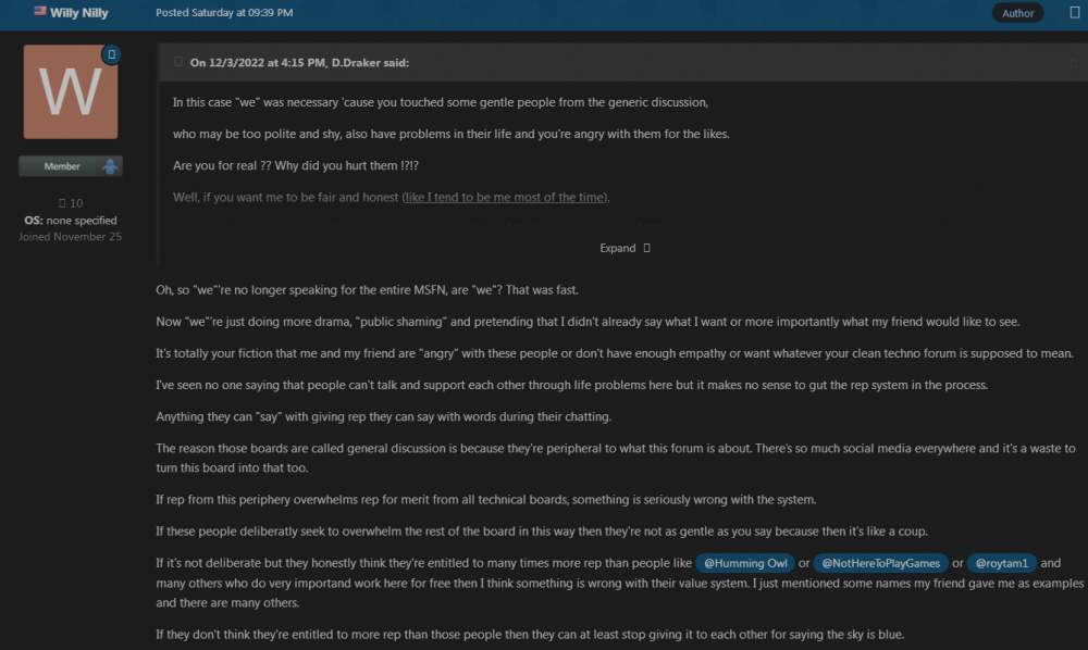 @msfntor, @XPerceniol, @mina7601, @UCyborg, maybe @AstroSkipper too, as the most frequent users of this topic/section, did you notice the list of the users who are "allegedly" not happy with the way you receive your likes/upvotes ? Yep, NotHereToPlayGames is right in the sweet middle . And you put likes/upvotes on literally every word he writes. ... undivided love.... LOL https://msfn.org/board/topic/184138-rep-farming/?do=findComment&comment=1231412