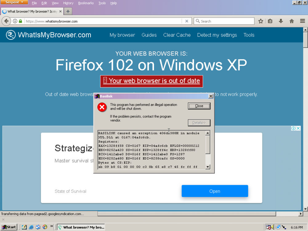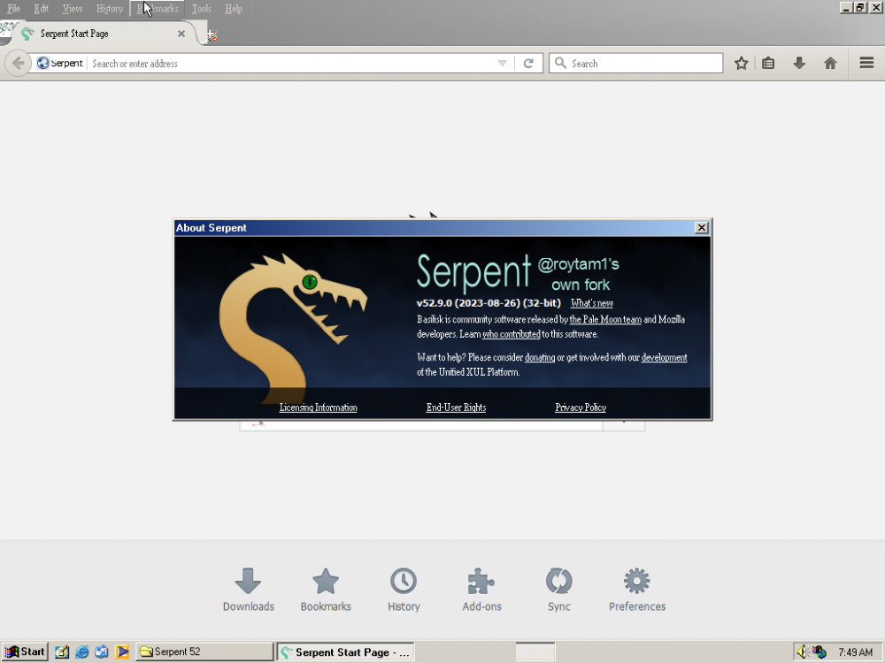 Thanks! Now I can run Serpent 52 and 55 on my Windows ME and Windows 98 (VM). The good thing is that for those who stuck on Firefox 48/45 ESR can use this browser by downloading the IA-32 version from https://o.rthost.win/basilisk and replace RaiseException with GetLastError on mozjs.dll and xul.dll (don't forget to add XP dlls and change dependentlibs.list). Also, github.com works! (meaning that you can download files, etc). Not sure if it works on Serpent 55, if it's not then you can try Serpent 52 (because it is more stable than Serpent 55).
