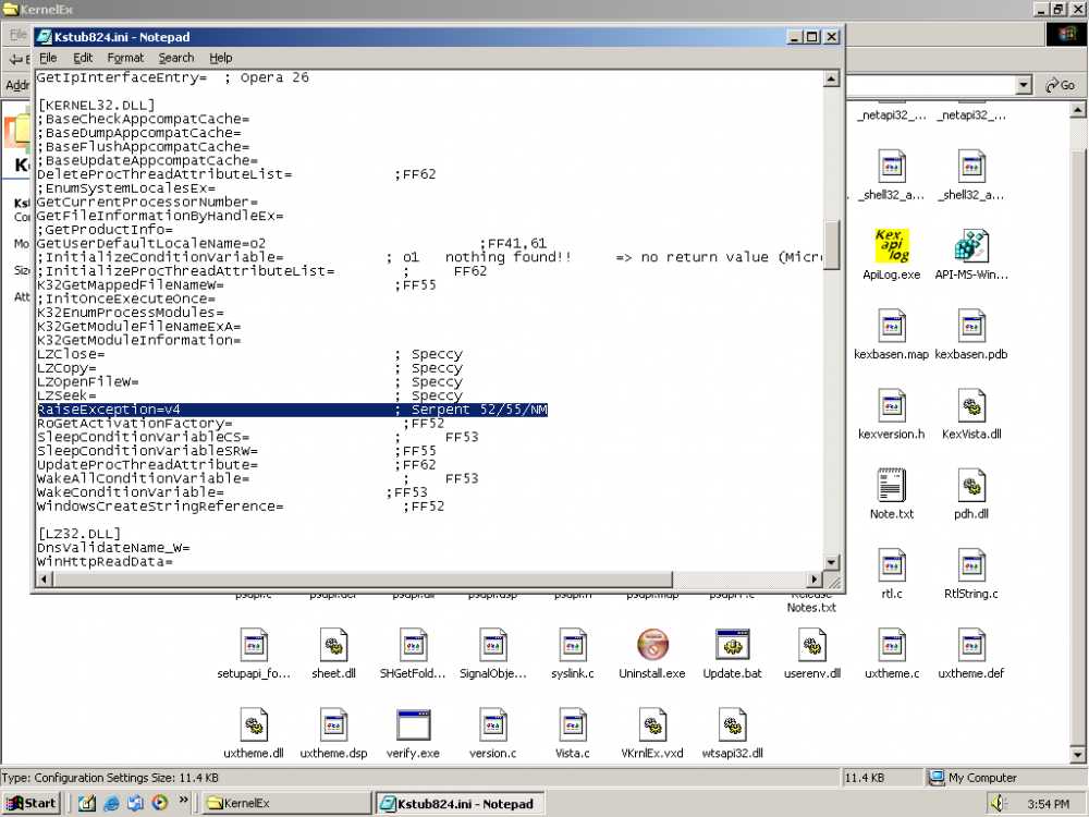 Is there a way to launch Serpent 55 without using Kstub825 or Enable API logging + ApiLog method? I do have Kstub825 but I don't use it since it tends to break both IE and Explorer (while desktop works) so I reverted back to 824. [OLEAUT32.DLL] 0327= Doesn't seem to work on 824 so I really wonder if it's possible to add it.