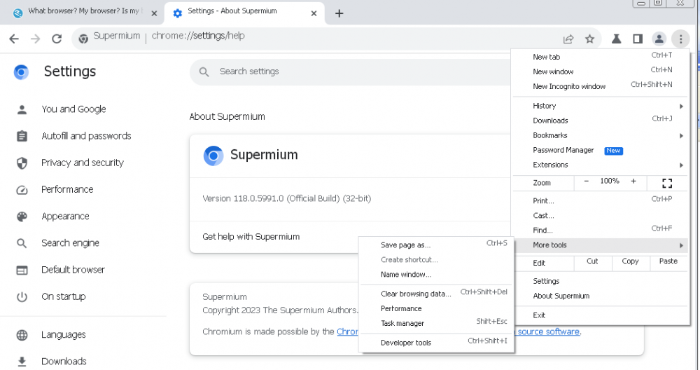 For those who are curious about the progress of win32ss getting Supermium to run on XP. It's from a tester. ignore the ugly trapezoidal tabs. image is from here anyway https://www.reddit.com/r/windowsxp/comments/18p7wrn/shhhh/