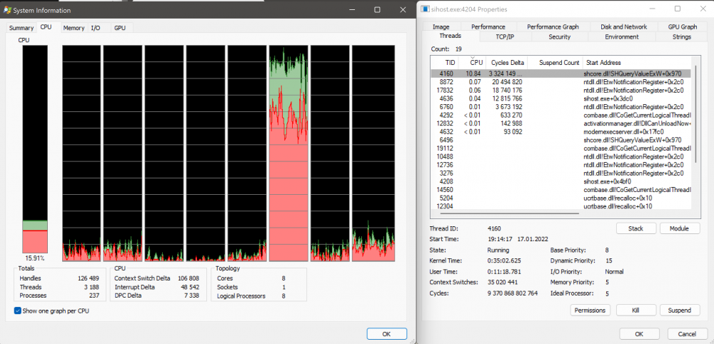 Windows 11, any release versions, now 21H2. Periodically I have some kind of glitch in the sihost.exe process, it starts to load one core of the processor at 100%. This bug only appears after installing StartAllBack and only rebooting helps.