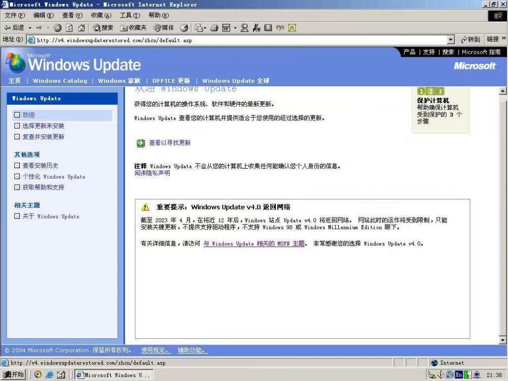 重要提示:Windows Update v4.0 恢复运作 截至2023年4月,在将近12年后,Windows Update v4.0 将恢复运作。目前网站的功能将受到限制,只能安装关键更新,不提供驱动程序支持,眼下尚不支持Windows 98或Windows Millennium Edition。 有关详细信息,请访问与 Windows Update 相关的MSFN主题。非常感谢您选择 Windows Update v4.0。