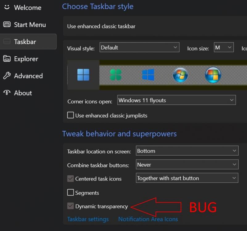 I believe there is a bug with the dynamic transparency feature. When I turn it on, the taskbar becomes completely transparent when I'm on desktop. But when I right click on a minimized window or one of the pinned items on the taskbar, it is no longer completely transparent. If possible, add a feature in the future that let's you keep the taskbar completely transparent all the time.