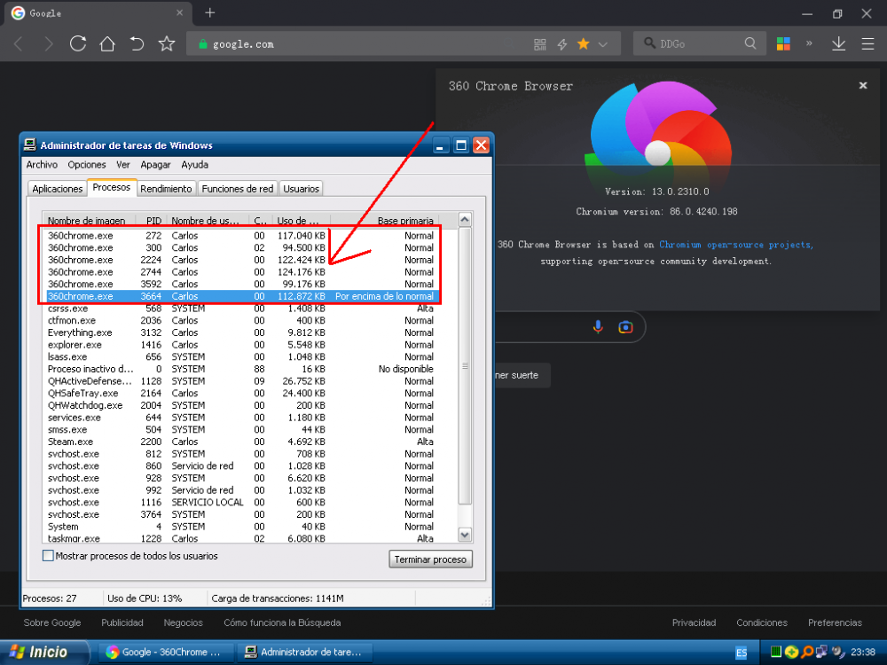 Hello everyone, I am having a problem with the Chinese browser 360Chrome, this has not happened to me before, it is very strange, this pc is clean, has no virus, I use 360 Total Security, is my usual browser, but I noticed something strange, the use of ram memory is very high, approximately for each process are between 100 and 150 megs or more and starts to use a lot of the page file. This pc has only 1 GB of ram, but I repeat, this has not happened before. I have the latest version "13.5.2042.0" even, I tried the previous version "13.5.2036.0" and it is still the same.
