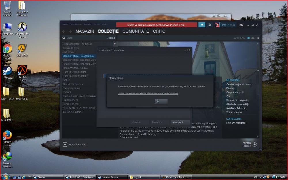 1. Hi, I need some help with steam. I want to know if I have any solutions to run steam on windows vista in 2023 I have tried exkernel, but I saw that it does not help me when it comes to steam. I currently have windows vista ultimate x86 Help please! my copy is in Romanian, so I will translate for you: ( An error has occured when downloading Counter-Strike (content servers unreachable)