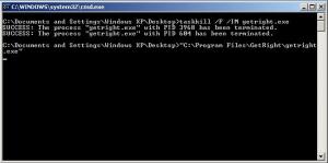 This worked cmdow @ /HID taskkill /F /IM getright.exe "%PROGRAMFILES%\GetRight\getright.exe"