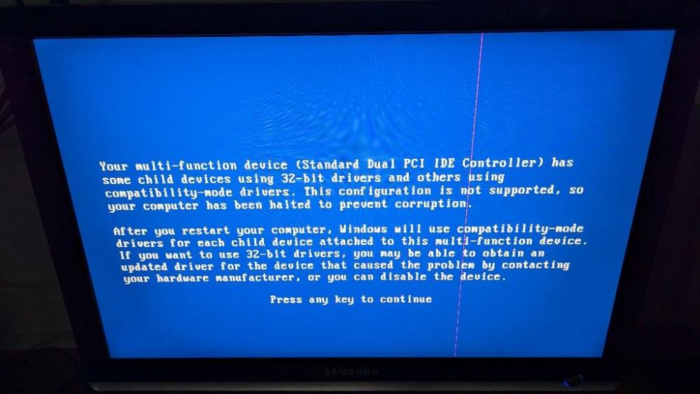 I have an MSI P965 Neo2 board. The PC is a dual boot system with Win98SE and Win XP. There are official drivers for XP for this board, and for Win98SE I used the retrofitted ICH8 drivers to get full support. The issue I'll be describing now is not related to the chipset drivers, however, as the issue already existed before installing the drivers. This board is a bit special. It has one IDE connector for two devices which are occupied by a DVD and a CD drive/burner. Then there are 4 SATA-II ports and one special SATA port that identifies everything connected to it as IDE (very helpful when installing Win98 on an SSD!). Also, there's a floppy drive. An SSD is attached to the first SATA port and an HDD to the second SATA port. The SATA-as-IDE port is currently not in use (only for the installation of Win98). The issue is that on 98SE I am not able to use the two drives connected via IDE. They are not even being recognized. In the device manager under hard disk controllers, there are 3 entries (Intel ICH8 4 port SATA storage controller, Intel ICH8 2 port SATA storage controller and Standard Dual IDE PCI controller). I have those entries in 98 and XP. Each of these three controllers has a primary IDE controller and a secondary IDE controller. In 98, those six controllers all have the yellow exclamation mark telling me that they don't work and/or I should update a driver. They work fine on XP and I can see both IDE drives. On Vogons there is thread that someone fixed this by setting the controller options to either off, both or alike etc. I did that but I had no success. Is there some logical combination I could try that maybe I forgot? What other approaches could there be? As a consequence of those controllers not working, I also have my file systems in MS-DOS compatibility mode and got a blue screen (not "of death") on first boot after installation, that "your multi-function device (Standard Dual PCI IDE Controller) has some child devices using 32-bit drivers and others using compatibility-mode drivers. This configuration is not supported [....] Windows will use compatibility-mode drivers for each child device attached to this multi-function device. [....]". Happy to provide more information. What I already checked is the configuration of the three main controllers on XP. They seem to be using different interrupts there, but I wouldn't know what to make of this.