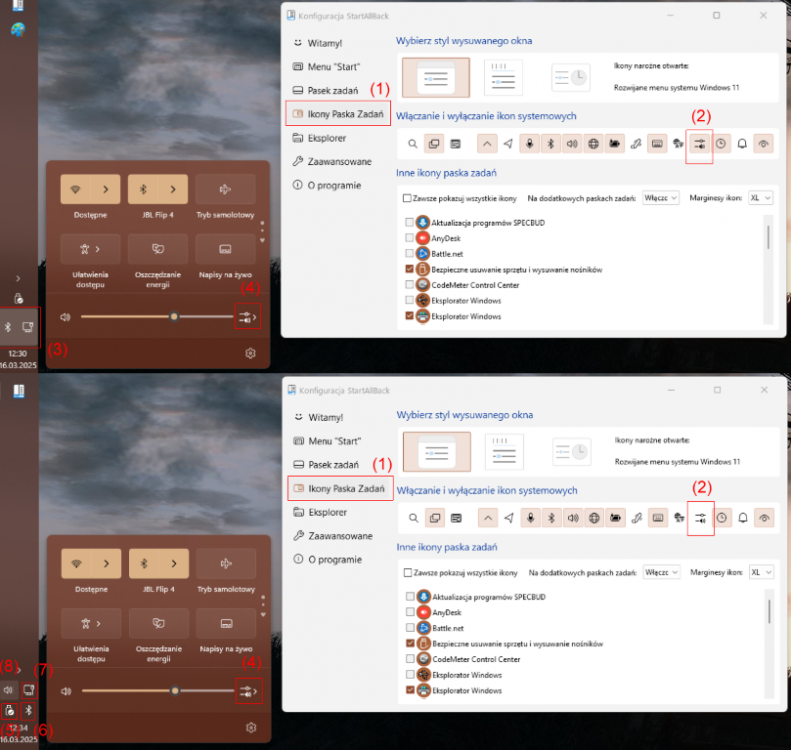 Additionally, (8) displays the same options as (3). However, there is no way to display the (4) icon on the taskbar.