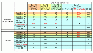 I have 3 pretty standard WIntel boxes, plus a newly setup multi-boot #4 with 3 OSes, all connected via ethernet switch by TCP/IP to operate under one same workgroup. Booted in 98 SE or XP Pro+sp2, Box #4 Network Neighborhood sees all 3 others, and vice versa, and data transfers perfectly between all. However, booted in NT4 Wks+sp6a, Box #4 Network Neighborhood sees none of the 3 others, and vice versa, thereby data can't transfer between Box #4 and any other. Also, booted in NT4 Wks+sp6a, Box #4 fails to ping any of the other 3 boxes, whilst on the contrary all 3 others succeed in pinging Box #4. Where does the problem possibly lie? Any directions will be highly appreciated. TIA!