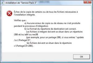 hi ! im trying to integrate the SP3 on my XP SP2 cd, so i downloaded the sp3 from the microsoft servers, i launched nlite, selected my directory where i copied my cd, but when i try to integrate the SP3,everythign is good during the extraction, than it begins to copy the files, till the end, when an error message is displayed saying something like "an error has occured during the copy of the files from the service pack to the cd" thx bye PS : im on vista