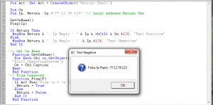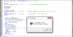 What IP Address did you use, that a default local adresss for the computer running the script. Here what I done so far Dim Act :Set Act = CreateObject("Wscript.Shell") Dim Os Dim Ip, Return :Ip ="127.0.0.1" '-> Local Address Return Yes GetOsName() Ping(Ip) If Return Then MsgBox Return & ", Ip Reply : " & Ip & vbCrLf & Os,4128, "Test Positive" Else WScript.Echo Return & ", Ip Reply : " & Ip,4128, "Test Negative" End If '-> Get Os Name Function GetOsName() For Each Obj in GetObject("winmgmts:").InstancesOf(_ "Win32_OperatingSystem") Os = Obj.Caption Next End Function '-> Ping Computer Function Ping(P) If Act.Run("Ping -n 1 -w 300 " & P, 0, True) = 0 Then Return = True Else Return = False End If End Function Ip True Ip False -