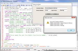 If you learned about HTA and the various scripting langauges that can be used you could make something like this to present to the end user. <!--February-05-13 Hta And Script By Gunsmokingman Aka Jake1Eye This code is property of Gunsmokingman and Or Jake1Eye and you must have his permission to use. This is only posted as example code and meant only to used as such.--><TITLE>Demo User Input</TITLE><HTA:APPLICATION ID="UserIn"SCROLL="No"SCROLLFLAT ="No"SingleInstance="Yes"ShowInTaskbar="No"SysMenu="No"MaximizeButton="No"MinimizeButton="No"Border="Thin"BORDERSTYLE ="complex"INNERBORDER ="No"Caption="Yes"WindowState="Normal"APPLICATIONNAME="DmUserIn"Icon="%SystemRoot%\explorer.exe"><STYLE type="text/css">Body{Font-Size:9.25pt;Font-Weight:Bold;Font-Family:Segoe Ui, Arial,Tahoma,Comic Sans MS;Color:Black;BackGround-Color:#EFE9E3;Text-Align:Center;Vertical-Align:Top;}TD{Font-Size:8.25pt;Font-Weight:Bold;Font-Family:Segoe Ui, Arial,Tahoma,Comic Sans MS;Color:Black;}.Tbx{Font-Size:8.25pt;Font-Weight:Bold;Font-Family:Segoe Ui, Arial,Tahoma,Comic Sans MS;Color:Black;}BUTTON{Height:15pt;width:60pt;Cursor:Hand;Font:8.05pt;Font-weight:bold;Font-Family:Segoe Ui, Arial,Tahoma,Comic Sans MS;Color:#404040;Text-Align:Center;Vertical-Align:Middle;filter:progid:DXImageTransform.Microsoft.Gradient(StartColorStr='#E5E5E5',EndColorStr='#7D7D7D');Margin:1;Margin-Top:15pt;Padding:2;Border-Left: 1px Transparent;Border-Right: 2px Transparent;Border-Top: 1px Transparent;Border-Bottom: 2px Transparent;}</STYLE><script LANGUAGE='VBScript'>'-> Resize And Place In Approx Center Of ScreenDim Wth, Hht :Wth = int(475) :Hht = int(255)window.ResizeTo Wth, HhtMoveTo ((Screen.Width / 2) - (Wth / 2)),((Screen.Height / 2) - (Hht / 2))'-> Function To Process The Submit ButtonFunction MySubmit()If Len(In1.value) = 0 And Len(In2.value) = 0 And Len(In3.value) = 0 Thenalert("No Textboxes Have Any Information")ElseIf Len(In1.value) >= 1 And Len(In2.value) = 0 And Len(In3.value) = 0 Thenalert("Only TextBox 1 Information : " & In1.value & vbCrlf & _"Please Fill In Textboxes 2 And 3 Then Press Submit")ElseIf Len(In1.value) >= 1 And Len(In2.value) >= 1 And Len(In3.value) = 0 Thenalert("TextBox 1 Information : " & In1.value & vbCrlf & _"TextBox 2 Information : " & In2.value & vbCrlf & _"Please Fill In Textboxes 3 Then Press Submit")ElseIf Len(In1.value) >= 1 And Len(In2.value) >= 1 And Len(In3.value) >= 1 ThenIf Len(In2.value) = 5 Thenalert("Sucess All 3 Textboxes Filled In" & vbCrlf & _"TextBox 1 Information : " & In1.value & vbCrlf & _"TextBox 2 Information : " & In2.value & vbCrlf & _"TextBox 3 Information : " & In3.value)Elsealert("Error Needs The Last Five Digits From Invoice Number : " & In2.value)End IfEnd IfEnd Function</SCRIPT><BODY><!-- Customer Name Area --><TABLE><TD Style='width:101;'>Customer Name</TD><TD><INPUT Type='TextBox' ID='In1' Class='Tbx' Size='40' MAXLENGTH='128'><TD></TABLE><!-- Two Textboxes Start --><TABLE><!-- Invoice Number Area --><TD Style='width:101;'>Invoice Number</TD><TD><INPUT Type='TextBox' ID='In2' Class='Tbx' Size='5' MAXLENGTH='5'Style='Margin-Right:15;' Title="Use Only The Last Five DigitsOf The Invoice Number"></TD><!-- Type Of Job Area --><TD Style='width:101;'>Type Of Job</TD><TD><INPUT Type='TextBox' ID='In3' Class='Tbx' Size='10' MAXLENGTH='15'><TD></TABLE><!-- Buttons Start --><BUTTON ID='Bn1' OnClick='MySubmit()'>Submit</BUTTON><BUTTON ID='Bn2' OnClick='window.close()'>Close</BUTTON><BODY>