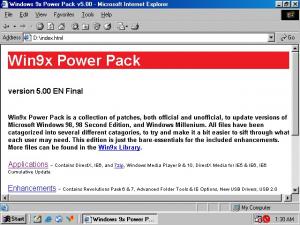 After a long, long time in development, and then re-development, I present to you Win9x Power Pack version 5.00 ENGLISH. If you have a broadband connection, be prepared to download about 180MB of files, which will extract to 190MB. You will be able to create an ISO file right from the build script, which is a feature that earlier releases could have benefited from. It's even easier to update now - take a look at the URLS files - they're plain-text files with URLS for files to download. Everything is nice and simple. Everything is scripted, and very little is asked of you when you use the build script. I've simplified the build script with several comments, so that future maintainers of the project can figure out how to modify the script to their needs. This release has taken a tour of the world, and has come back bearing gifts. It is intended to update a Windows 98 First Edition, 98 Second Edition, or Windows Millenium Edition Installation. For some patches, you will need a license and installation media for Windows Millenium. The included Readme.txt and Changelog.txt files point out specifics. I've also included documentation for LameSkin, a free skinning engine developed by Tihiy for use in Windows 98 SE. More documentation will follow if there is a need for it. For now, grab the latest version here: http://www.win9xpp.org/library/w9xppv505.zip (797KB, ZIP), unpack this zip file to a free directory (Such as C:\W9xpp\), and run W9xBuild.bat. Press the number 1 at the prompt, and wait a while. When it is done, the script will return you to the main menu. Future releases will be released as a single 7zipped archive, and can be applied directly through the Build script's menu system. Full download: http://www.megaupload.com/?d=10NW11TE edit: New Patch released July 21st - v5.05! edit2: I'm working on v5.1, as of March 14th, 2008!