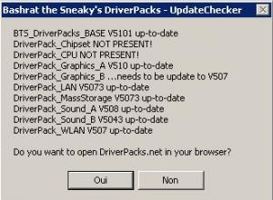 Hello, I create an auto-it srcit for replace update checker. This script is universal update checker and base on download the information of : http://www.driverpacks.net/Projects/Driver...dateTracker.php If this page is up-to-date, is not for the moment (Graphics B is not up-to-date) the update checker is universal update checker. If replace it on ancient update checker, the exe show the information. If exe not replace the update checker. The exe launch a "choose folder" for select folder of driverpacks... Bashrat_the_Sneaky__s_DriverPacks___UpdateChecker.exe