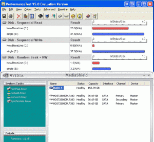 Write speed of a single drive when not setup in a raid array is 37.8 MB/second Write speed to the drives when in a raid 5 array is 0.89 MB/second. Can anyone help on why the write speed is so slow. It is very noticeable. I'm constantly waiting on the hard drive light to go off before I am able to do anything. CPU: Intel® Pentium® 4 CPU 3.20GHz Motherboard: Model: P5ND2-SLI Manufacturer ASUSTeK Computer INC. Model P5ND2-SLI BIOS Vendor Phoenix Technologies, LTD BIOS Version Nvidia - 42302e31 BIOS Release Date 08/06/05 Hard Drives: 1. Hitachi Deskstar 7K80 80GB 7200RPM 8MB Buffer SATA-II 2. Hitachi Deskstar 7K80 80GB 7200RPM 8MB Buffer SATA-II 3. Hitachi Deskstar 7K80 80GB 7200RPM 8MB Buffer SATA-II Raid-5: Name NVIDIA RAID5 153.38G Capacity 153.38 GB NVRAID Driver 5.10.2600.529 Memory: Total Physical Memory 2.00 GB Frequency 667.0 MHz Video: NVIDIA GeForce 6600 GT Driver 7.1.8.9 NVIDIA GeForce 6600 GT Driver 7.1.8.9 Sound: Realtek AC'97 Audio Driver 5.10.0.5820