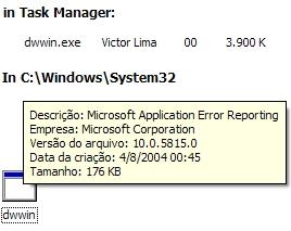 Hello! I'm having some problem with this application. dwwin.exe is located at system32 folder and is used to report errors, but it locks the system with a lot of programs I start. For example, I still couldn't install Incredimail XE Portuguese edition, 'cause it starts and the system gets low and low, and the mouse moves lower than normal, so I open up windows task manager and I see that f***** program running and when I kill the process it closes the other program I'm trying to run. It happens frequently when I'm on the internet, but sometimes it locks every program that I start (ex. WinRAR, IsoBuster....). I really want to solve this problem. Did anyone have this kind of problem? By the way, my sistem is Windows XP SP2 Brazilian Portuguese, 256MB, GeForce4 64MB and a LOT of programs running (Firefox 1.5.0.1, Winamp 5.11 with Modern Skin, Incredimail XE Premium (English version), Windows Live Messenger 8.0 BETA, AVG 7.1 plus Firewall [control center], mouse and keyboard apps, The Cleaner Registry and Process Viewer, nVidia apps...) There's a picture showing details of the f***** program. Thanks!