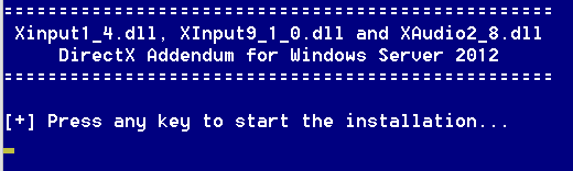 DirectX Addendum for Windows Server 2012 and 2012 R2 Microsoft only included partial DirectX functionality in Windows Server 2012 and 2012 R2 This Addendum will restore full functionality by installing Xinput1_4.dll, XInput9_1_0.dll and XAudio2_8.dll respectively from Windows 8.0 and 8.1 Also make sure to install the DirectX June 2010 Redist https://www.microsoft.com/en-us/download/details.aspx?id=8109 The Addendum can be installed before or after the DirectX June 2010 Redist. The files from the Addendum can also be manually copied to an offline image ! How-to : - Extract folder "Server 2012" or "Server 2012 R2" depending on your OS - Right-click on Install.cmd and select "Run as administrator" - Follow the on-screen instructions ! - Done ! Credits Allukend from the now defunct http://www.win2012workstation.com/ website for the original script Alternative MediaFire Download Link : https://www.mediafire.com/file/7tdsy5v2u1gqkw2/DX_ADDENDUM.rar/file MSFN Download Link : DX_ADDENDUM.rar