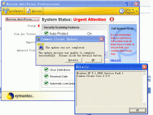 Hi, I've just installed Norton Anti-Viurs 2004 on my computer. When I've tried to do a LiveUpdate, I coudlnt' updated two components: 1. Norton Anti-virus professional 2. Common Clinet Core Will some1 help me out here, please? Thanks in advance.