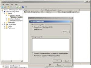 I'm trying to create an upgrade of an existing GPO that deploys an application. (add another MSI-patch to the existing package) When I edit the GPO and click the Upgrades tab I do not get any options here like mentioned in various Microsoft books and guides on the Internet. I have tried with Current Group Policy and A specific GPO but still the same. The window where the package should be is empty. See screendump Any one know what I'm doing wrong here?