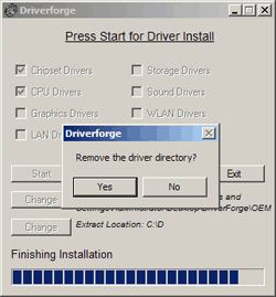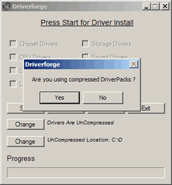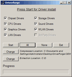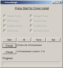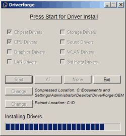 DRIVERFORGE Maybe you know the problem: you have a PC with a missing driver and you dont like to search the net for the right one. So - thats the solution. Driverforge searches automatically the driver you need and installs it. Driverforge is a frontend for SPDrvScn + Driverpacks and brings this 2 things together. RUNNING THE PROGRAM First download the drivers from Driverpacks.net. If You have driverpacks already integrated into your Windows CD, you can put Driverforge everywhere you like on your CD, it will recognize the OEM (driver) folder automatically. When the program starts, it automatically finds what compressed Driverpacks you have in your Driverpacks folder and auto selects them all. You can put more Driverpacks in the DriverPacks folder and hit the "All" button to refresh, as it were, to get the updated list. You can click the "None" button to deselect all DriverPacks. And then select only the ones you want. Clicking the "Change" button on the "Compressed Driver Location" will bring up a message box asking you if your using compressed drivers. Clicking no will change the 7zLoc or Compressed Location to UnCompressed. Clicking the "Change" button on the "Drivers Extraction Location" or "UnCompressed Drivers Location" will change where the compressed files will be extracted to or where the already uncompressed DriverPacks are located. If you put driverforge on a removable drive, name the directory with the compressed drivers inside "OEM". Once the drivers are done installing you can choose to delete the uncompressed DriverPacks location. If you want to integrate your own drivers (3rd-party), the 7zip file has to begin with "DP3...". Maybe "DP3rd.7z" or "DP_3" like "DP_3rd.7z". >Here< is the tutorial, how to integrate your own drivers. THE INI FILE The INI file is named driverforge.ini which will get automatically created if one is not manually created. [Driver] DriverExtract= 7zLoc= DriverExtract - The location of the uncompressed drivers location or the location that the Driverpacks will be extracted to. If you leave it blank it will default to C:\Drivers. Make sure to put the full path. DriverExtract variables X:\Drivers (or any other fully usable folder path location), Blank 7zLoc - The location of the compressed DriverPacks. If you set this to UnCompressed it will tell the program that you are using UnCompressed Drivers. If you leave it blank it will default to UnCompressed. If there is a folder called OEM in the same folder that the DriverForge is being run from it will select that location ONLY if you have not specified a directory or if you've set OEM in the driverforge.ini. 7zLoc variables UNCOMPRESSED, OEM, X:\DriverPack7z (or any other fully usable folder path location), Blank PICS DOWNLOAD Updated on Dec.28.2007 to Version 1.0 :xxxx THE PROJECT IS STILL OPEN: NOW HERE MODERATED BY KICKARSE !!!! >>>Driverforge uses SPDrvScn from Vernalex and Driverpacks from Driverpacks.net. Thanks for your work!<<<