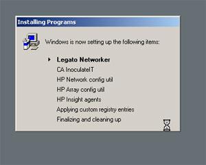 Hi, I've run into a very strange problem, when I run my unattended ISO for Windows 2003 in my virtual enviroment RunOnceEx does what it's supposed todo. This screen shows up, programs installing and everyone is happy. But... when I run then same ISO on a physical server everything is going fine until RunOnceEx... Windows autologon and a gray screen, Programs is installing but the window telling everyone whats going on is just gone. It's a bit frustrating... Can someone help? I've run out of ideas... this is my RunOnceEx.cmd cmdow @ /HID @Echo Off IF EXIST D:\CD.txt SET CDROM=D: IF EXIST E:\CD.txt SET CDROM=E: IF EXIST F:\CD.txt SET CDROM=F: IF EXIST G:\CD.txt SET CDROM=G: SET PP=%cdrom%\Apps\ SET KEY=HKLM\SOFTWARE\Microsoft\Windows\CurrentVersion\RunOnceEx REG ADD %KEY% /V TITLE /D "Installing Programs" /f REG ADD %KEY%\000 /VE /D "Legato Networker" /f REG ADD %KEY%\000 /V 1 /D "%PP%legato\NetWorker.msi /qn" /f REG ADD %KEY%\001 /VE /D "CA InoculateIT" /f REG ADD %KEY%\001 /V 1 /D "\"%PP%CA\eTrust Antivirus.msi\" /qn" /f REG ADD %KEY%\002 /VE /D "HP Network config util" /f REG ADD %KEY%\002 /V 1 /D "%PP%HP\net_conf\cp005319.exe /s" /f REG ADD %KEY%\003 /VE /D "HP Array config util" /f REG ADD %KEY%\003 /V 1 /D "%PP%HP\array_conf\cp005393.exe /s" /f REG ADD %KEY%\004 /VE /D "HP Insight agents" /f REG ADD %KEY%\004 /V 1 /D "%PP%HP\insight_agents\cp005413.exe /s" /f REG ADD %KEY%\005 /VE /D "Applying custom registry entries" /f REG ADD %KEY%\005 /V 1 /D "REGEDIT /s C:\install\nomys.reg" /f REG ADD %KEY%\005 /V 2 /D "REGEDIT /s C:\install\legato.reg" /f REG ADD %KEY%\006 /VE /D "Finalizing and cleaning up" /f REG ADD %KEY%\006 /V 1 /D "C:\install\cleanup.cmd >> C:\Errors.log 2>&1" /f EXIT and this is my WINNT.SIF [Data] Autopartition = 0 MsDosInitiated = 0 UnattendedInstall = Yes OemDrivers = OemInfFiles [Unattended] UnattendMode = FullUnattended UnattendSwitch = Yes OemPreinstall = Yes OemSkipEula = Yes FileSystem = * WaitForReboot = No NoWaitAfterTextMode = 1 NoWaitAfterGUIMode = 1 DriverSigningPolicy = Ignore NonDriverSigningPolicy = Ignore Hibernation = No [OemInfFiles] OemDriverFlags = 1 OemDriverPathName = "%SystemRoot%\nldrv" OemInfName = "ich5core.inf","cpqcidrv.inf","q57win32.inf","cpqcisse.inf","cpqcissm.inf" [GuiUnattended] AutoLogon = Yes AutoLogonCount=1 EncryptedAdminPassword = No AdminPassword = "1234" TimeZone = 110 OEMSkipRegional = 1 OemSkipWelcome = 1 [Shell] DefaultThemesOff = Yes DefaultStartPanelOff = Yes [LicenseFilePrintData] AutoMode = PerSeat [Components] Indexsrv_system = Off [UserData] ProductKey = ComputerName = * FullName = OrgName = [RegionalSettings] Language = 041d [Networking] InstallDefaultComponents = Yes [WindowsFirewall] Profiles = WindowsFirewall.TurnOffFirewall [WindowsFirewall.TurnOffFirewall] Mode = 0 [Identification] JoinWorkgroup = install