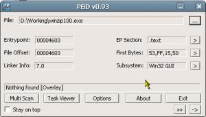 2. I verified at work and it happens definitely with the new version 1.1 as you can see on the screenshot. I'm verifying what could be the difference between home and work. Here at work nothing special is installed. As you can see on the second screenshot the message "Nothing found [Overlay] is delivered from PEid.exe. I will report if I find something. Saluti