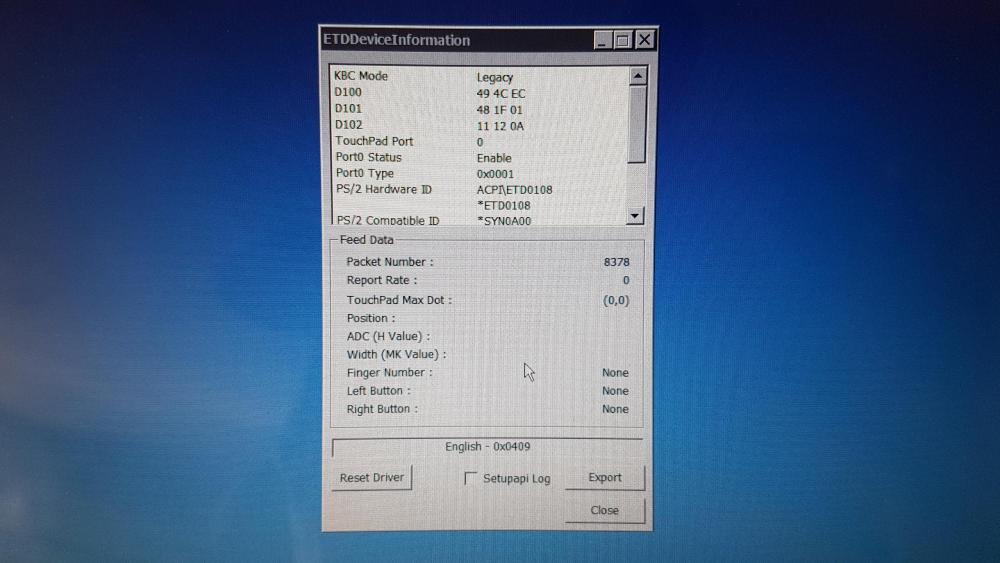 The Device Information does see the change, but only after a reboot. The two relevant files are attached. Also a picture of what I'm seeing in the Device Information program window. When I use the trackpad, the "Packet Number" reading changes, and the "Report Rate" reading. Nothing else registers though, like using the buttons. ETDDeviceInformationAfterChangeBeforeReboot.txt ETDDeviceInformationAfterChangeAfterReboot.txt