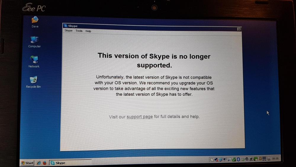 Just tried to use Skype 7.36 on my dual boot netbook. I got the same result on Windows 8.1 as I did on Windows 10 on my main machine, a non-overridable update window. On the Windows XP side I got this - Strangely, Skype 7.36 still seems to be working under XP on my main machine, now the last place that it is working! I can't explain that, and I suspect that it won't last for long! Such a pain, I really don't like Skype 8, quite apart from the fact that it won't work on XP, as it doesn't keep your entire conversation history any more. You can save what you've already got locally from Skype 7, but that's it. They say Skype 8 only keeps the last year's worth of conversations, and only in the cloud, not locally, and as far as I can see after they're more than a year old the posts are irretrievably binned, and there's nothing you can do about it. Absolute rubbish!