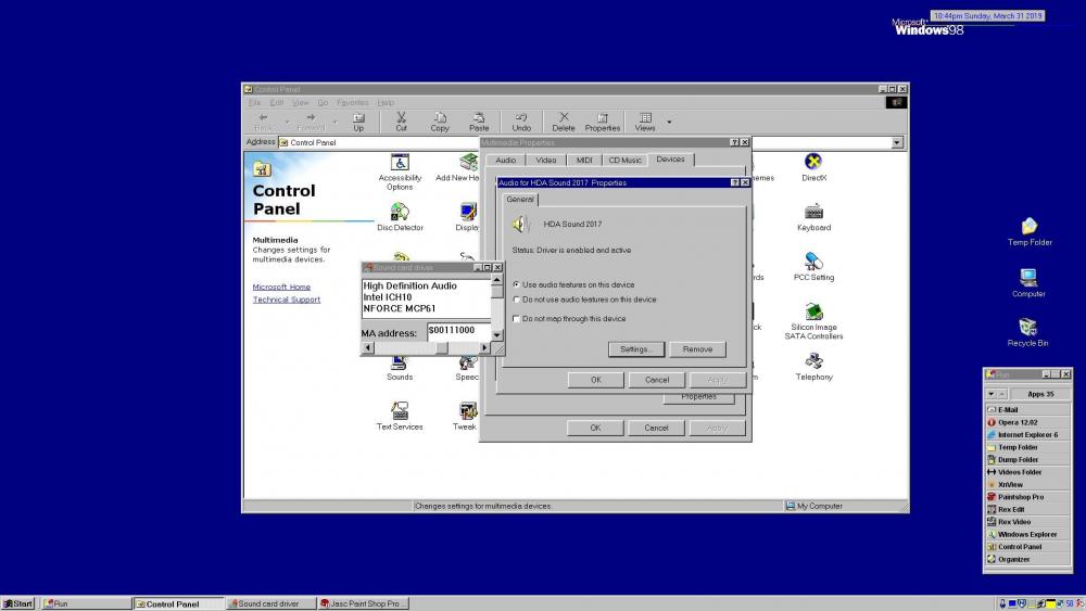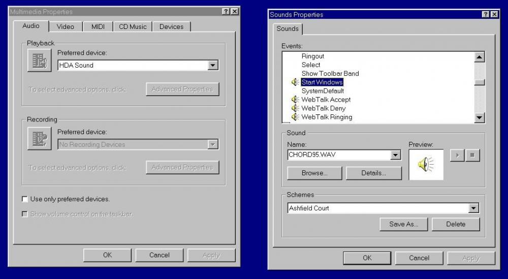 Well I tried again with the changes made to system.ini, but sad to report that there seems to be no difference. The "HDA Sound" option still seem to come and go as it pleases, and even when it's there sounds don't play. In fact now the slider on the Sound Recorder isn't moving across when a file is played any more, and although the test sounds option isn't popping up the error message about the card possibly being in use any more, it's still not producing any sound when a file is played. I am using @rloew's RAM Limitation Patch 7.0 by the way, just in case this is relevant, but I'm sure you realised that already. Sorry I completely forgot to respond to the the query about installing with the SETUP /p i option. It's so long ago that I last installed Windows 98 that I can't remember if I used that option, but almost certainly no as I would have been installing on what was then a fully compatible system. I have to say that I'm not too enthusiastic about the thought of reinstalling Windows 98 from scratch again just on the off-chance that it might fix this! The system as it stands has been so tweaked and customised over the years that it would take forever to get it back to as it was again. One or more of these tweaks may now be causing this problem of course, but how to eliminate them from blame I really don't know.