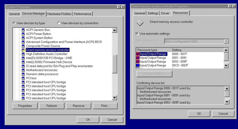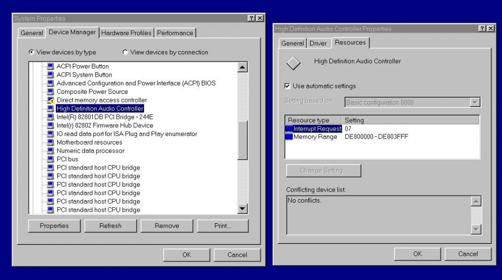 Thanks for sticking with this @deomsh, I really appreciate it! This is the Device Manager details of the Audio Driver, which shows no conflicts. As you can see there are other conflicts in the system, which have always been there, both on the "Direct memory access controller" and the "System timer". I have never been able to resolve these conflicts, I assume they're just because I'm using a motherboard that just isn't designed to work with Windows 98. They have never seemed to cause any problems, perhaps until now! This is the "Direct memory access controller" problem - And this is the "System timer" problem - They don't seem to be conflicting with each other, but with "Motherboard resources". Could this have any bearing on why the sound still isn't working? If so, I fear that it won't be resolvable.