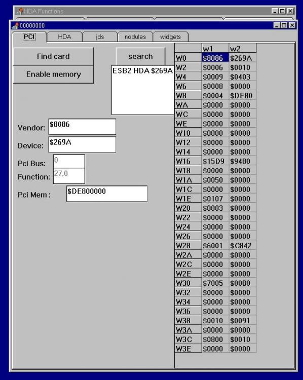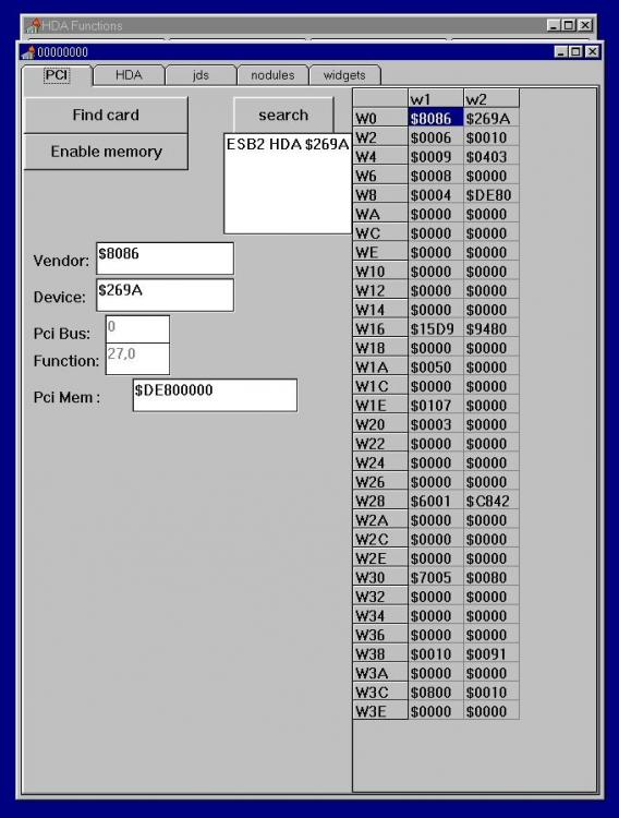 Sorry for the delay, I've been busy today! The contents of my HDACFG.INI file are here - [ALLHDA] $00D8=$269A8086 $0101=$0BE910DE [HDA] TSR=TSR Found PCI_VID=$8086 PCI_DID=$269A [BUSMASTER] myPCIHI=$0012 myPCILO=$1000 myPCI=$00121000 aPCIHI=$0011 aPCILO=$1000 aPCI=$00111000 [HDA_269A8086,948015D9] cardmemregistersLO=$0000 cardmemregistersHI=$DE80 Mytimer=1 Verbinterface=$1 wait1=$100 wait2=$100 pcipatchB=$0000 PCI_BUS=$00 PCI_DEVICE=$1B PCI_FUNCTION=$0 GCAP=$4401 VMIN=$00 VMAJ=$01 GCTL=$0001 CODEC BITMAP=00000100 CODEC Index=$2 CODEC_VID=$10EC CODEC_DID=$0883 CODEC_REV=$100002 CODEC_NODEINFO=$010001 CODEC_AFG_GPIO_CAP=$40000002 CODEC_AFG_SUBSYSTEM_ID=$15D99480 CODEC_AFG_PM_SUPPORT=$0F CODEC_AFG_PCM_DEFINITION=$E0560 CODEC_AFG_F000B=$01 SleepingWidget=$02 VolumeWidget=$14 OutputWidget=$02 [Volume] PCM=$FFFFFFFF I've attached the memory file you asked for too. I hope this gives some clue as to what's going on! Cheers, Dave. HDADAVEH.TXT