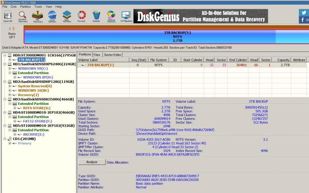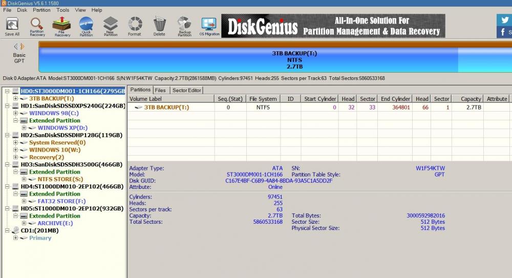 @Andalu OK, back again! I now have this card. I tried to find the two port version, but no luck anywhere, so I had to get a four port one. As said, in the 'no boot' mode, it appears in XP as an IDE controller. The only problem is that it keeps on trying to install another IDE controller, and when the driver is being installed, the system just freezes permanently. This happens even in Safe Mode. Any idea why that would be @Andalu, and did you find the same problem? In Windows 10 it appears as a normal storage controller, exactly the same as all the other cards I've got. The good news is that it works fine on both systems with my 3TB disk fine, and going between XP and 10 no longer seems to result in any file system errors on the drive. This is how it's seen by Disk Genius in XP. Of course, it's much too early to say whether it will be reliable in actual use, but it's looking quite hopeful! It does have more than 2TB of data on it. Cheers, Dave.