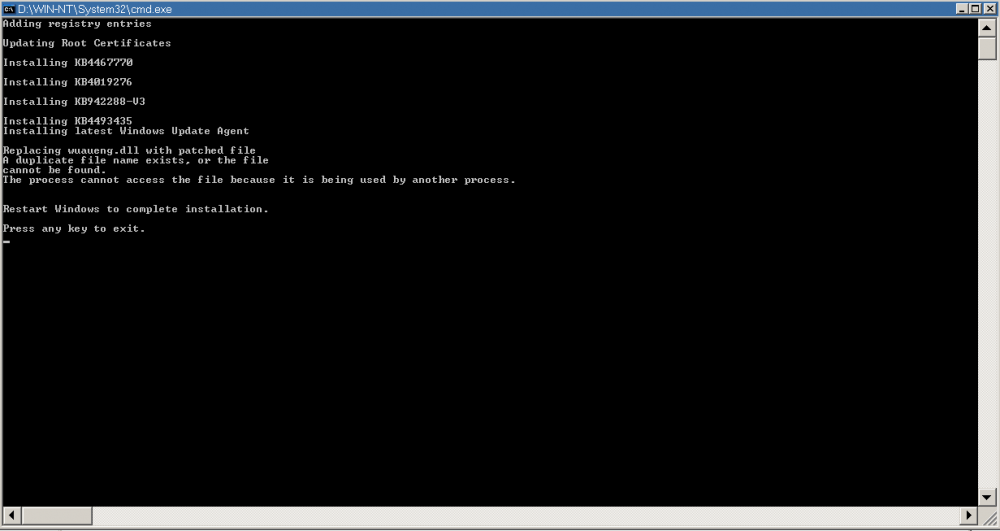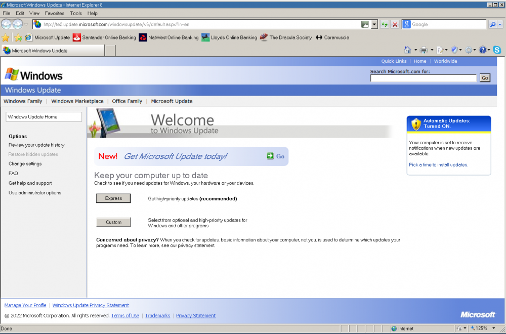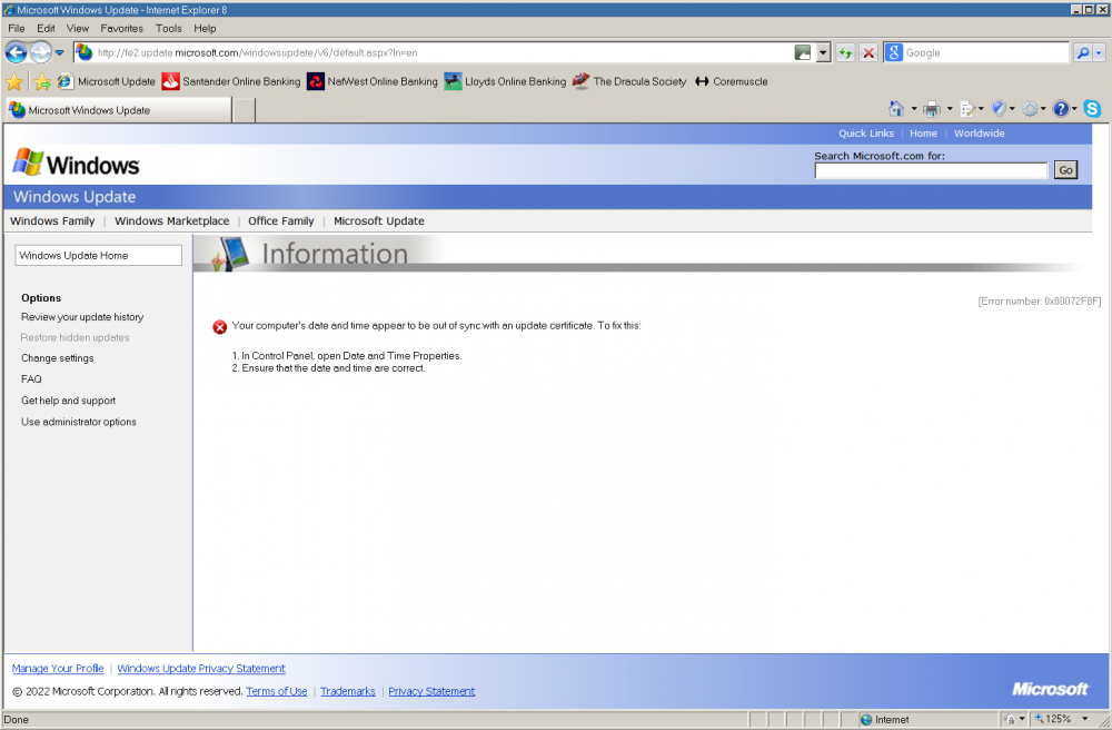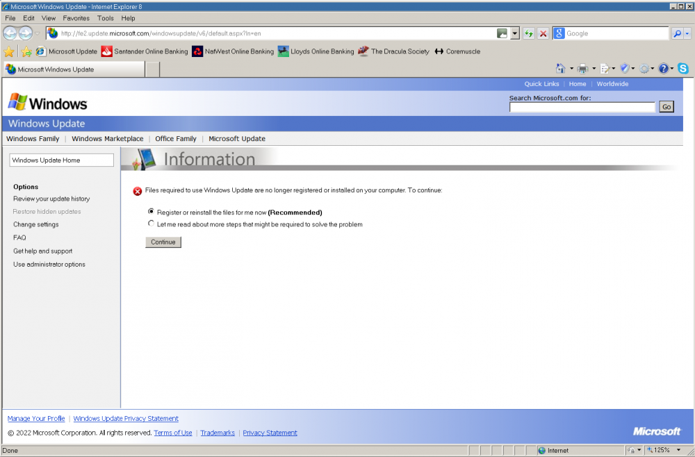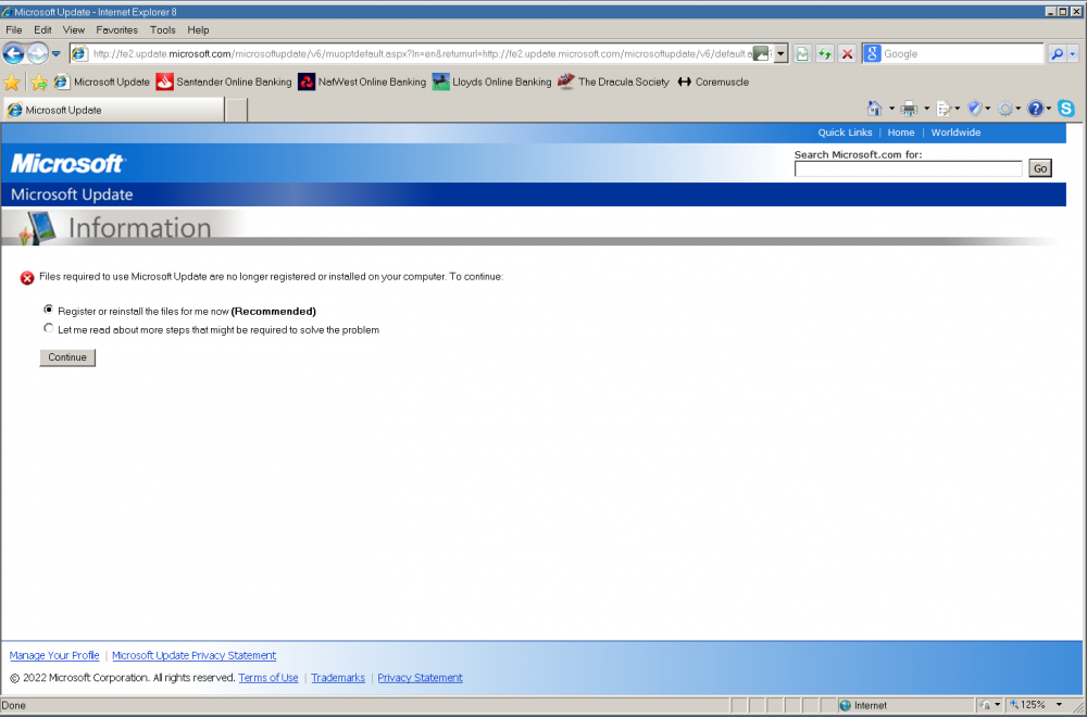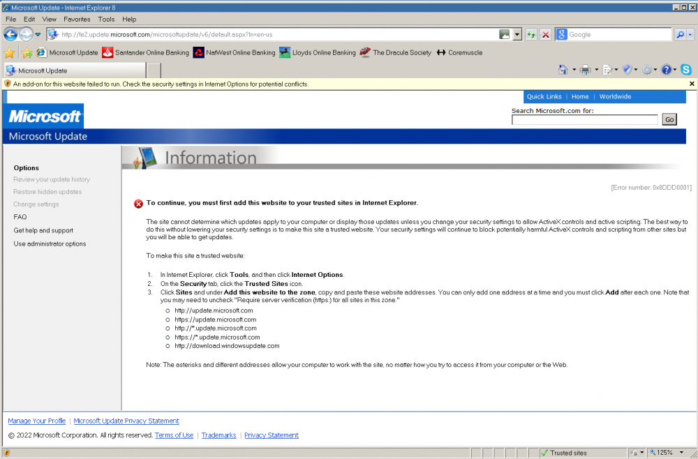 I did re-register those files some time ago, but it didn't change anything. Initpki.dll took a long time before it reported that it was registered, the other three were pretty instant. Anyway, I've given all that a try, and the only thing which didn't seem to work in the cmd file was replacing wuaueng.dll. After rebooting I found there was no wuaueng.dll in the DLLCache folder, and the one in System32 was version 5.4.3790.5512, the one from SP3. Anyway, I corrected that manually, and the version now in System32 and the DLLCache is 7.6.7600.256. I'm now getting this - There are a number of sites now listed in the Trusted Sites list, more than before, and more than the message says. They are - *.microsoft.com *update.microsoft.com *windowsupdate.com *windowsupdate.microsoft.com http://update.microsoft.com http://www.update.microsoft.com https://www.update.microsoft.com ProxHTTPSProxy appears to be working fine on other sites, but shows no output now on Microsoft Update.
