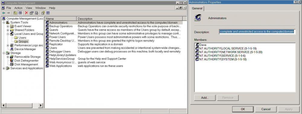 No problem! I read what you posted previously, and all I can say is that my "Dave" account is the default Administrator account, and always has been. It's always apparently worked perfectly like that.