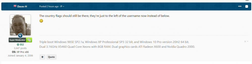The country flags should still be there, they're just to the left of the username now instead of below.