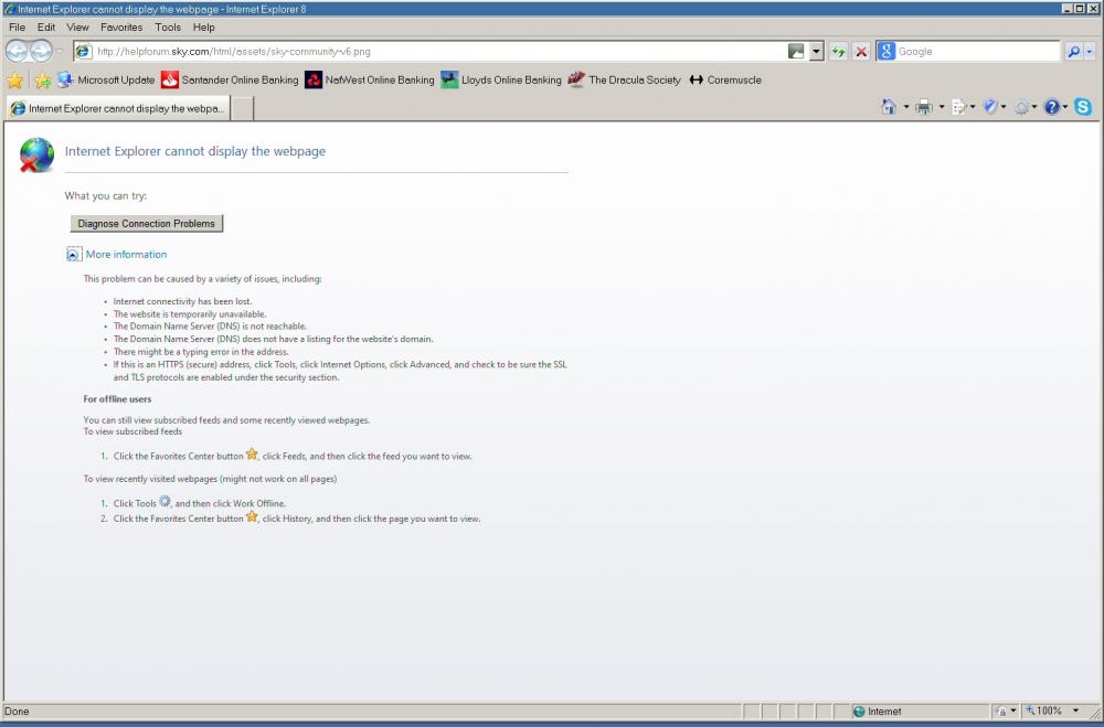 Sadly not. I normally only have the system set to use the proxy with https sites, and without it the http URL just produces the standard "Internet Explorer cannot display the webpage" message, with no specific reason given. If I set things to use the proxy on http sites as well as https after again a very long delay I get this - 502: HTTPError The following error occurred while trying to access http://helpforum.sky.com/html/assets/sky-community-v6.png HTTPConnectionPool(host='helpforum.sky.com', port=80): Max retries exceeded with url: /html/assets/sky-community-v6.png (Caused by NewConnectionError(': Failed to establish a new connection: [WinError 10065] A socket operation was attempted to an unreachable host',)) Generated on 2021-06-05 18:25:12.087625 by ProxHTTPSProxyMII FrontProxy/v1.5. So, a different message!