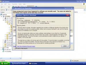 15. hi! i'd just like to verify if the following screenshots refer to defender not being able to update or it finding some software with malware in my system: also these from D8761.txt: QueueVer=1 UI LCID=1033 Date=4/12/2007 Time=11:27:06 AM ReportSize=313 Bytes=bytes Kilobytes=KB Megabytes=MB MoreInfo=What data does this error report contain? ErrorSubPath=Generic\mptelemetry\8024402c\endsearch\search\1.1.1593.0\mpsigdwn.dll\1.1.1593.0\windows defender Stage1URL=/StageOne/Generic/mptelemetry/8024402c/endsearch/search/1.1.1593.0/mpsigdwn.dll/1.1.1593.0/windows defender.htm Stage2URL=/dw/generictwo.asp?EventType=mptelemetry&P1=8024402c&P2=endsearch&P3=search&P4=1.1.1593.0&P5=mpsigdwn.dll&P6=1.1.1593.0&P7=windows defender General_Reportee=Microsoft BP0=mptelemetry BP1=8024402c BP2=endsearch BP3=search BP4=1.1.1593.0 BP5=mpsigdwn.dll BP6=1.1.1593.0 BP7=windows defender BP8=NIL BP9=NIL BP10=NIL CBP=11 DWVer0=11 DWVer1=0 DWVer2=6555 DWVer3=0 Details_Sig_Body=EventType : mptelemetry P1 : 8024402c P2 : endsearch P3 : search P4 : 1.1.1593.0 P5 : mpsigdwn.dll P6 : 1.1.1593.0 P7 : windows defender QueueMode=268435457 EventID=5000 ReportingFlags=0 UIFlags=1 LoggingFlags=0 MiscFlags=0 EventLogSource=MPSampleSubmission General_AppName=Mallware Signeture Download Final_Link=Prevent this problem in the futurealso found in D8761.cab are 2 .txt files: client_manifest.txt & version.txt ... thanks!
