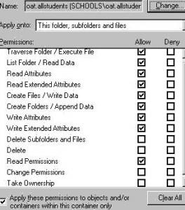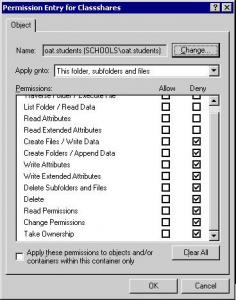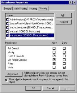 Hi FAT64, Here are the screen shots: Main folder permissions: Main folder advanced permissions (deny students write): Sub folder (within main folder) permissions: Sub folder advanced permissions (allow students write to subfolders): Yet as I said, students are able to move subfolders into each other within the main folder Obviously those permissions are allowing students to write to the subfolders but I thought that the 'deny' write permissions set on the main folder would take preference over any other permissions set. I hope those screens show enough info. P.S. I might just add exactly what I'm hoping to achieve: Main folder - oat.students can read but not add any files or create new folders (only use existing folders) Subfolders - oat.students can read and add files within the subfolders but not delete files or folders. Cheers, Doak. -