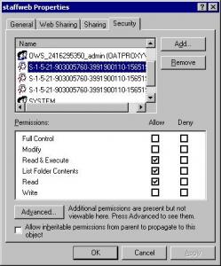 Hey all, I wondered if anyone might be able to help me with a small problem I'm having with an intranet subweb folder on a 2K Server.. All of a sudden, each day one of my subwebs loses it's permissions. Here is a pic of what I mean: At this point no one can access the subweb (permission denied). I found that if I attempt to add one of the three user groups back in manually, all three user groups will re-appear in the list and access is granted.. until the next morning when it is back to how it is in that print screen! Any ideas? Cheers, Doak.