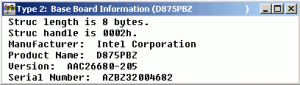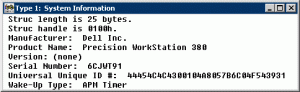 I found another way for you to determine the make and model of the computer to facilitate driver and application installation based on BIOS data like Manufacturer and Model.It's called WMIC for Windows Management Information Command (aka command-line utility) that runs from a .CMD or .BAT file to query EVERYTHING under the sun from SMBIOS info, Windows info, Hardware, User Accounts, Startup programs, just about anything you ever wanted to know about a Windows system via a command-line utiltiy! The best part is it's included in XP/2003 and I didn't have to install anything special to use it! Go to a CMD prompt and type WMIC, it will install and then you will be inside a WMIC prompt (if it fails to install from the CMD window just do a Start/Run WMIC and press enter). Type /? to find the w-i-d-e array or commands. Read more on WMIC at http://www.microsoft.com/technet/prodtechn...y/wmic.mspx#ECD Here's an example of some information you can retrieve, but there is LOTS more you can get at: U:\>wmic wmic:root\cli>csproduct get Name Name Precision WorkStation 380 wmic:root\cli>cpu get AddressWidth, CurrentClockSpeed, DeviceID, Name AddressWidth CurrentClockSpeed DeviceID Name 32 2992 CPU0 Intel(R) Pentium(R) D CPU 3.00GHz 32 2992 CPU1 Intel(R) Pentium(R) D CPU 3.00GHz wmic:root\cli>exit Version Here's an example of how to use it in a .CMD file: U:\>wmic csproduct get Name, Vendor > whatami.txt U:\>type whatami.txt Name Vendor Precision WorkStation 380 Dell Inc. Hope this helps some trying to perform unattended installations out... I am addicted to query the WMI now!