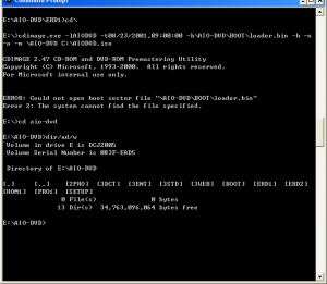 Hello, EveryBody: I made a Multi-Boot DVD according you said on the web page at http://flyakite.msfnhosting.com/. But I was failure. And on the final step, I was tried to make a ISO image file, use the command: cdimage.exe -lAIODVD -t08/23/2001,09:00:00 -b\AIO-DVD\BOOT\loader.bin -h -n -o -m \AIO-DVD C:\AIODVD.iso , and there was a line error message on the screen means the "Could not boot sector file "\AIO-DVD\BOOT\loader.bin"", please see the attached screenshot. Yes, there wasn't the "loader.bin" file in the "\BOOT" folder. It was only a "chshell.ini" file exist the "\BOOT" directory. What's wrong with me. Please help me. Thanks And Best Regards