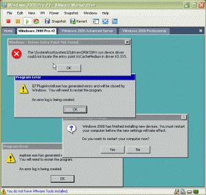 When I try to install DirectX9c and IE6+sp1 via RunOnceEx at first logon with a normal win2k unattended I get these errors. Look at the image attached. Theres a QuickTime error in there on the screenshot as well. But my latests test was with IE and DX only that resultet in the same errors. Even though windows bitches and moans, after the reboot IE6 and DX9c are installed and SEEMS to be working as they should. Help! I need to get rid of these errors. Only VMware drivers are included in the install. My winnt.sif: ;SetupMgrTag [Data] AutoPartition=1 MsDosInitiated="0" UnattendedInstall="Yes" [Unattended] UnattendMode=FullUnattended OemSkipEula=Yes TargetPath=\WINNT OemPreinstall=Yes UnattendSwitch="yes" WaitForReboot="No" DriverSigningPolicy=Ignore OemPnPDriversPath="Drivers\hgfs;Drivers\memctl;Drivers\mouse;Drivers\net;Drivers\video" [GuiUnattended] AdminPassword=* AutoLogon=Yes AutoLogonCount=1 OEMSkipRegional=1 TimeZone=105 OemSkipWelcome=1 [UserData] FullName="Din mor" OrgName="Test Din Mor" ComputerName=* [TapiLocation] CountryCode=45 [RegionalSettings] LanguageGroup=1 SystemLocale=00000409 UserLocale=00000406 InputLocale=0406:00000406 [Identification] JoinWorkgroup=WORKGROUP [Networking] InstallDefaultComponents=Yes [GuiRunOnce] %systemdrive%\Install\instapps.cmd My instapps.cmd: @ECHO OFF ECHO. ECHO Installing Internet Explorer 6 + updates ECHO Please wait... start /wait %systemdrive%\install\IE6\ie.exe /Q:A /R:N ECHO. ECHO Installing DirectX 9.0b ECHO Please wait... start /wait %systemdrive%\Install\DirectX9c\dxsetup.exe /silent PAUSE start /wait shutdown -r