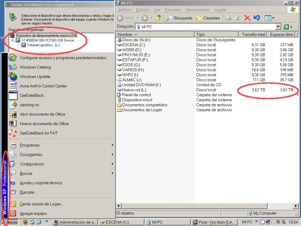 Since a few years ago there is a hoax spread on the Internet saying that the hard disks limits in MBR is 2 TiB. With the excuse that Windows can not address more than 32 bits. The truth is that the limit imposed in 2003 by LBA 48 bits gives the following results, actually 32 bits but according to the cluster size used in formatting, for example: Cluster 512 (old physical size used on hard drives) 2 ^ 32x512 = 2 TiB limit Cluster 4096 (current physical size used on hard drives) 2 ^ 32x4096 = 16 TiB limit Cluster 65536 2 ^ 32x65536 = 256 TiB limit These references are valid at least for traditional Windows formats, both FAT32 and NTFS. Also in the format exFAT can be formatted with a size of 131072 bytes Cluster 131072 2 ^ 32x131072 = 512 TiB limit However different websites have made a copy and paste an Internet text that says that the limit is in 2 TiB. Western Digital itself has stuck the same text on its website helping to spread the false rumor. This could have been propitiated because current versions of Windows are intentionally designed to not be able to read MBR disks larger than 2 TiB (checked in Windows 7). Forcing the use of the GPT format in Windows NT 6 (Vista - 7 - 8 - 8.1) (Windows 10 not checked) When Windows NT 5 (2000 SP2 - XP SP1 -2003) can work perfectly with hard disks larger than 2 TiB in MBR with the specified cluster sizes. Also all current versions of Linux are able to read and work with MBR hard disks larger than 2 TiB (checked since 2008). Following the line there are external USB hard drive enclosures that are capped to the limit 2 TiB for MBR disks. Against the physical limits are described above may have MBR hard disks with a single partition of 512 TiB. The catch is that Windows NT 6 is not able to read it by identifying the disk as faulty RAW. This is an example of a 4 TiB hard drive running perfectly on Windows XP connected to a LogiLink® USB 3.0 to IDE & SATA Adapter with OTB adapter (verified the same result on more than 10 computers running Windows 2000 and 2003). Windows XP Screenshot:
