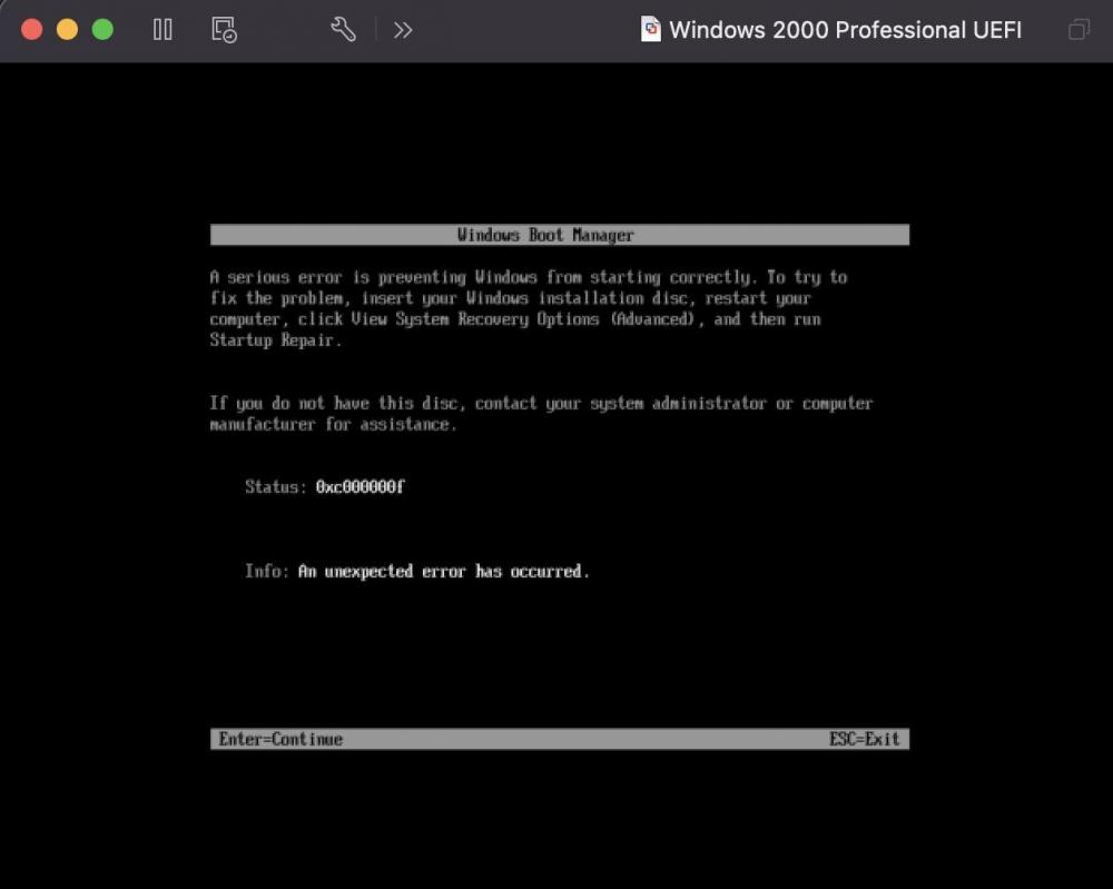 Hi, Is it possible to boot Windows 2000 on UEFI? I know it is possible to boot Windows XP and Whistler Beta 1 on UEFI, but wanted to know if it was possible to boot 2000 on UEFI. One person was able to boot Whistler Beta 1 on UEFI, but struggled with 2296. I tried this on Windows 2000, and followed the same steps shown in NTDEV'S XP UEFI video. When I try to boot it with the Vista 5219 files, I get the 0xc000000f error. What would need to be done to get 2000 running on UEFI? If it isn’t possible, why?