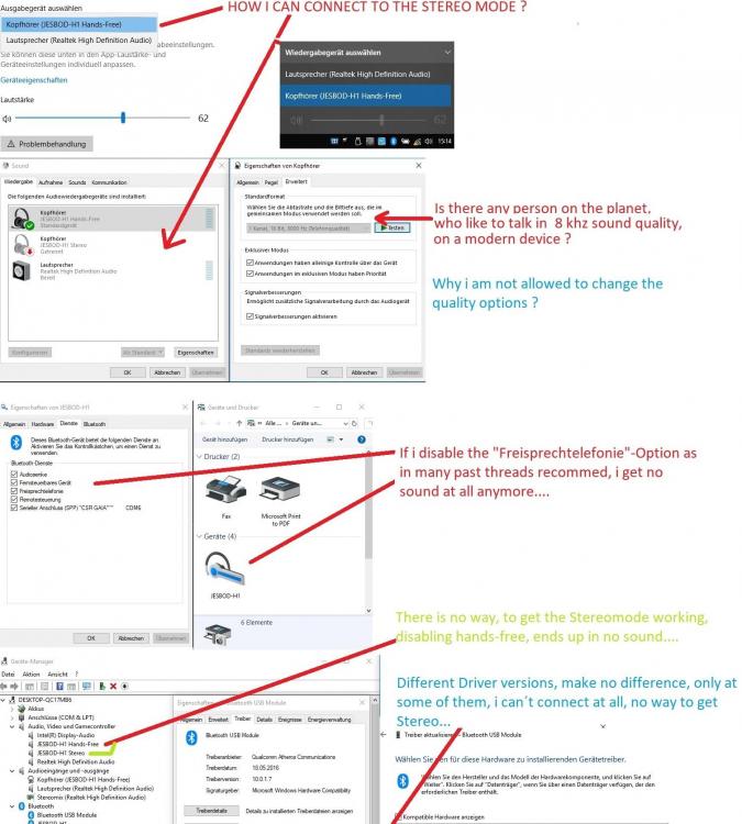 Hey Folks, i got crazy last days, cause there was absolut no way, to connect my Bluetooth headphones in a Quality Stereo mode, on my Laptop... - doesnt matter which driver i chosed, it just didn´t work as expected… - i searched Google, and there are allready some tips out there, but they didn´t help… - cause i couldn´t choose the Stereo mode in Sound Options, and so on... 8000 Hz with mono only... Here you can see the problem: HOW TO FIX: DISABLE: Bluetooth Audio Gateway Service (BTAGService), than restart Info: If you need the mic, than this is no solution… - but i am glad, that i found a fix after spending 2 days installing drivers, etc... Maybe: you need to remove, and pair the bt device after Restart...