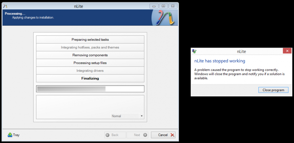 Hello, I have the files from an original retail Windows XP SP3 install disc that I would like to process with nLite 1.4.9.3, with the goal of integrating all updates to date (including Internet Explorer 8 and latest Windows Media Player) followed by removing some componenets that I don't want. I started by using the RyanVM Integrator 1.6.1b2.1 to include the OnePiece Windows XP Post-SP3 UpdatePack v1.0.7 followed by its "OnePiece Remove AddOn"s to get rid of a few items like Windows Search. I then used nLite to remove more components and did additional tweaks, hoping in the end to put all that into an ISO. However, during the last stage of using nLite - when it says "Finalizing" after compressing cabinets - it crashes (please see attached screenshot). At first I thought maybe it is because the install files I fed nLite was processed by RyanVM Integrator 1.6.1b2.1, so I retried the whole process on unprocessed/vanilla Windows XP SP3 files, but nLite crashes at the same stage. I also tried to run nLite in an existing Windows XP SP3 virtual machine, and it still crashes at the same point. What am I doing wrong? Here is the nLite INI file with all my settings: http://pastebin.com/YQ1p4tqJ