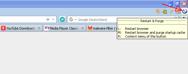 AstroSkipper Posted October 5, 2024 Author Posted October 5, 2024 (edited) On 2/10/2024 at 7:29 PM, AstroSkipper said: Restart & Purge - A custom button for restarting the browser and, if necessary, purging the startup cache, created by AstroSkipper As I have already reported in @roytam1's browser thread, I have been investigating the restart behaviour of New Moon 28 and Serpent 52 (and also Mypal 68, but this is off-topic here) for some time with a focus on the startup cache. Unfortunately, I have not been able to find much useful information or documentation on this topic on the internet. Even my request in @roytam1's browser thread also went unanswered (addendum: in the meanwhile, @VistaLover has replied here. Thanks again for that! ). It seems that detailed information or knowledge about the startup cache and how the browser restart affects this cache is practically non-existent. The startup cache seems to be a replacement for the former Fastload. It resides in the profile directory to store continuous chunks of data in it. In my New Moon 28 installation, without using the custom folder chrome for scripts and CSS stylesheets, only one file resides there with the name startupCache.4.little. As both, the folder and file name, contain the string startupcache, one can conclude that data is stored inside this file to accelerate the startup of the browser. Which data exactly I really don't know. I didn't find any meaningful documentation. I noticed that very often or in most cases the startup cache was cleared or reorganised automatically without any additional commands when restarting the browser. Sometimes, however, it remained unchanged after a restart. At least, I could find the code responsible for purging the startup cache. Anyway! One thing is clear. If the data in the startup cache is corrupted, then starting problems can occur which only can be solved by deleting its content. This can be done, for example, manually or by the commandline option -purgecaches. But there is no button or item to start this purge of the startup cache in a convenient way from within the UXP browsers. That's why I created a custom button for this purpose in JavaScript (rather a variant of JavaSript), the programming language used for creating new custom buttons by the extension Custom Buttons. I branded this custom button Restart & Purge. It performes a normal restart when left-clicked and additionally purges the startup cache when middle-clicked. After creation I have tested this custom button over a longer period of time, and it works for me as it should. Here is a small screenshot of my custom button Restart & Purge and its tooltip taken from New Moon 28: As the code of Restart & Purge has to be initialised, you won't find it in the tab "Code" but in the tab "Initialization code" of this custom button. Here is a screenshot of its code: The former download links unfortunately contained an XML backup file of the Restart & Purge custom button which either couldn't be installed without additional editing or some characters were not transferred correctly. The problem has to do with the conversion of custom buttons into XML format, where the tool I had used did not work correctly. This time I therefore provide a custom button link for direct install (when the extension Custom Buttons is already installed, of course ). Copy the quoted link below and open it in a new browser tab: I can't insert the code of the link in this post! The MSFN forum editor is totally broken and hasn't been working properly for months especially when it comes to inserting of links. This has already reported multiple times! Well done, who is responsible for it! Due to the shortcomings of the MSFN forum editor, I uploaded the custom button link of Restart & Purge as an HTML file. Here is the download link: https://www.mediafire.com/file/nrqim7ek9s6gp07/CB_button_Restart_%26_Purge.html/file Simply open this HTML file in a browser tab and click the embedded custom button link for Restart & Purge! For the installation of this button, the extension Custom Buttons is required which you can get from this post: https://msfn.org/board/topic/183923-extensions-and-custom-buttons-for-uxp-browsers-corrections-modifications-adjustments-and-special-recommendations/?do=findComment&comment=1226328 And since the legacy Custom Buttons extension runs in the UXP browsers, my custom button Restart & Purge can be used in New Moon 28, Serpent 52, Pale Moon and some other browsers. Greetings, AstroSkipper I have updated the code of my custom button Restart & Purge to let it run the fully native restart code inside the UXP browsers to avoid any abnormalities. Restart & Purge v2.0 will be released soon after some additional tests. In any case, it should work then with New Moon 28, Serpent, Firefox 52esr and even the non-UXP browser Mypal 68. And most probably also with Pale Moon and Basilisk (the call up of the native restart code should be the same as in the other browsers) which I can't test, though. Cheers, AstroSkipper Edited October 5, 2024 by AstroSkipper Update of content 2