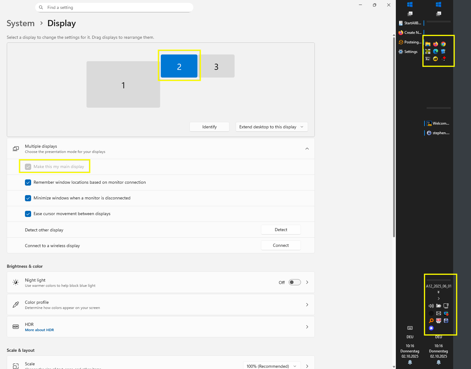 eekboom Posted 2 hours ago Posted 2 hours ago My setup is notebook on the left, two identical external displays to the right. I can use Windows' Display Settings to select the notebook as main display and StartAllBack acts correctly: It shows the tray icons and my configured custom toolbar folder on the notebook's toolbar. But if I make the middle display the "main display", then StartAllBack always treats the right display as "main". I even physically switched the monitors, but when II adjust the display order accordingly in Windows Display Settings, the bug is back. This screenshot shows the middle display and the left part of the rightmost display. (So there are two vertical taskbars at the right, the first one is from the main, middle display, the second one is from the rightmost (non-main) display.) If I switch "Use enhanced classic taskbar" off in the StartAllBack settings, the the default taskbar are correct.