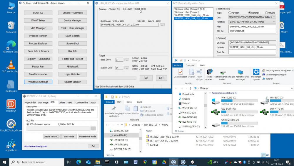 UEFI_MULTI can Add Boot Image files like .wim and .vhd to EFI Boot Manager Menu of Internal SSD Disk. As Example is shown to Add PE_19041_264_US_L_32.wim file to EFI Boot Manager Menu on EFI Drive Z: normally used to Boot Encrypted Drive D: with Windows 11 x64 Here Drive C: is from Windows 10 x64 Installed by WinNTSetup in 65 GB VHD file located on Encrypted Drive D: In this way we have MultiBoot of PE WIM from RAMDISK and Windows 10 x64 in VHD as FILEDISK and Windows 11 x64 in Encrypted Drive. In this MultiBoot configuration WIM and VHD files are located on Encrypted Drive D: of Internal SSD Disk. So even in case booting from USB is Not allowed we have a solution to boot easily with PE WIM file from RAMDISK to escape boot problems. Than we can decide to Repair or Apply an earlier Captured System Backup WIM file in VHD by using WinNTSetup in PE environment. Screenshot After booting with Windows 11 x64 from Encrypted Drive C: Win10_W2.vhd file with Windows 10 x64 in VHD and folder WinPE with PE WIM files are located on Encrypted Drive